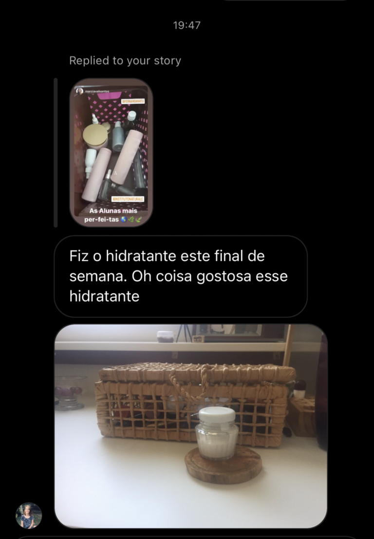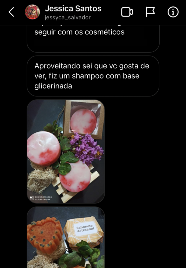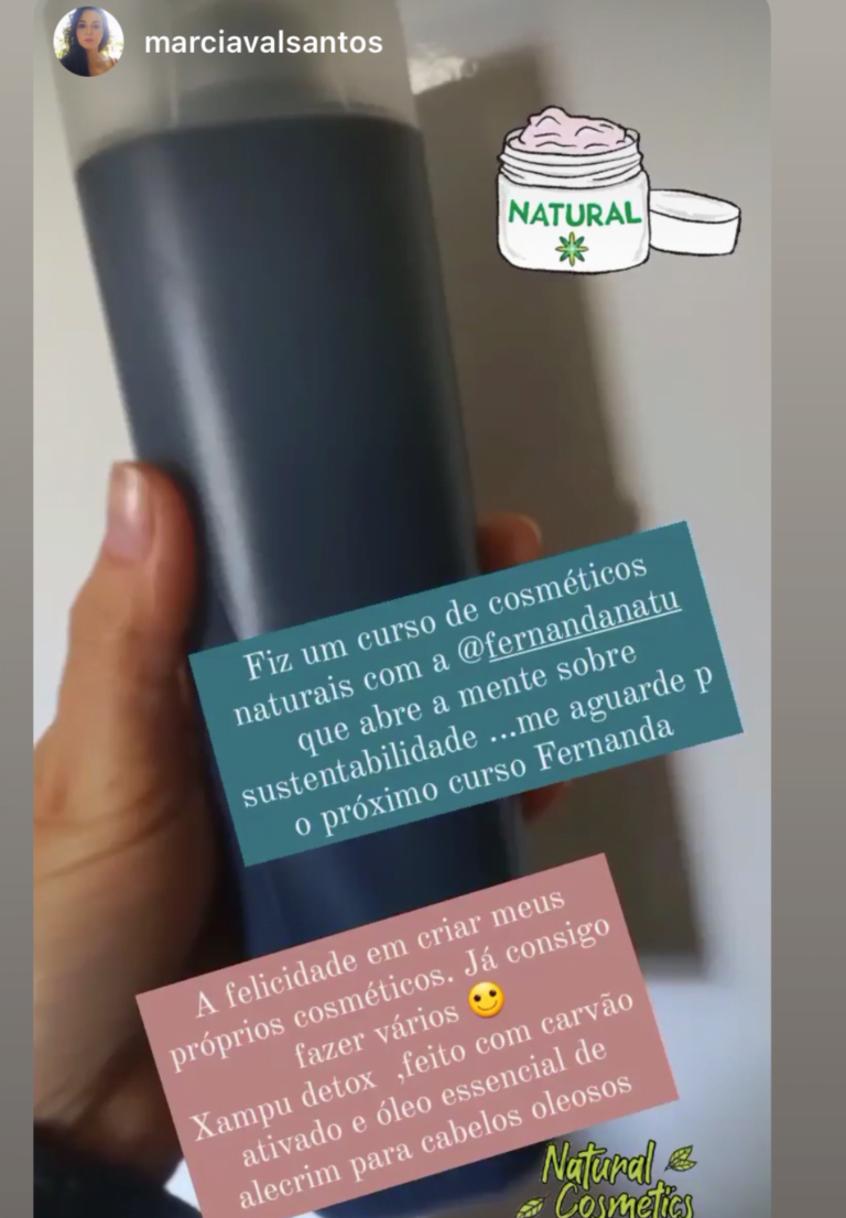A nossa aluna Jéssica começou fazendo oprodutos para uso pessoal e da família, e logo passou vender para pessoas próximasHoje, tem sua loja online participa de feiras, para vender seus cosméticos naturais